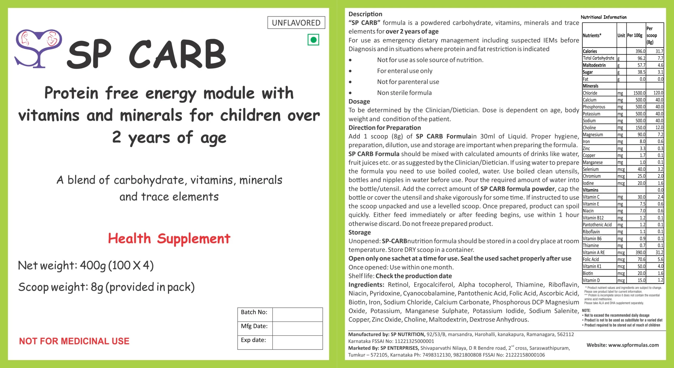 - SP CARB Formula should be mixed with calculated amounts of drinks like water, fruit juices etc. or as suggested by the Clinician/Dietician. If using water to prepare the formula you need to use boiled cooled, water. Use boiled clean utensils, bottles and nipples in water before use. Pour the required amount of water into the bottle/utensil. Add the correct amount of SP formula powder, cap the bottle or cover the utensil and shake vigorously for some time.